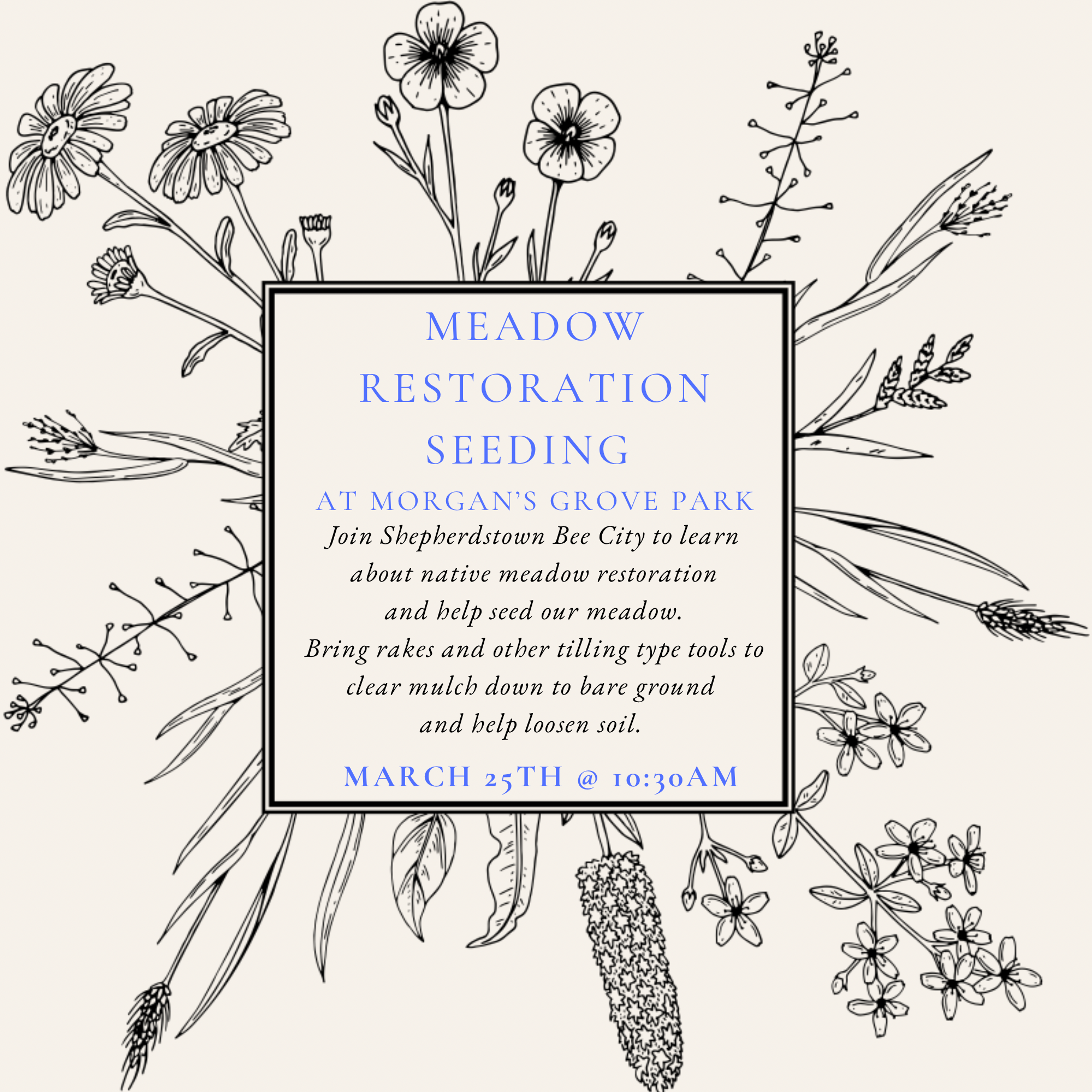 ‘Meadow Restoration Seeding: Bring rakes and other tilling-type tools to help us clear mulch down to bare ground and loosen the soil. Once the area is prepped, we’ll broadcast seed and cover with seed straw to help establish a thriving pollinator habitat.